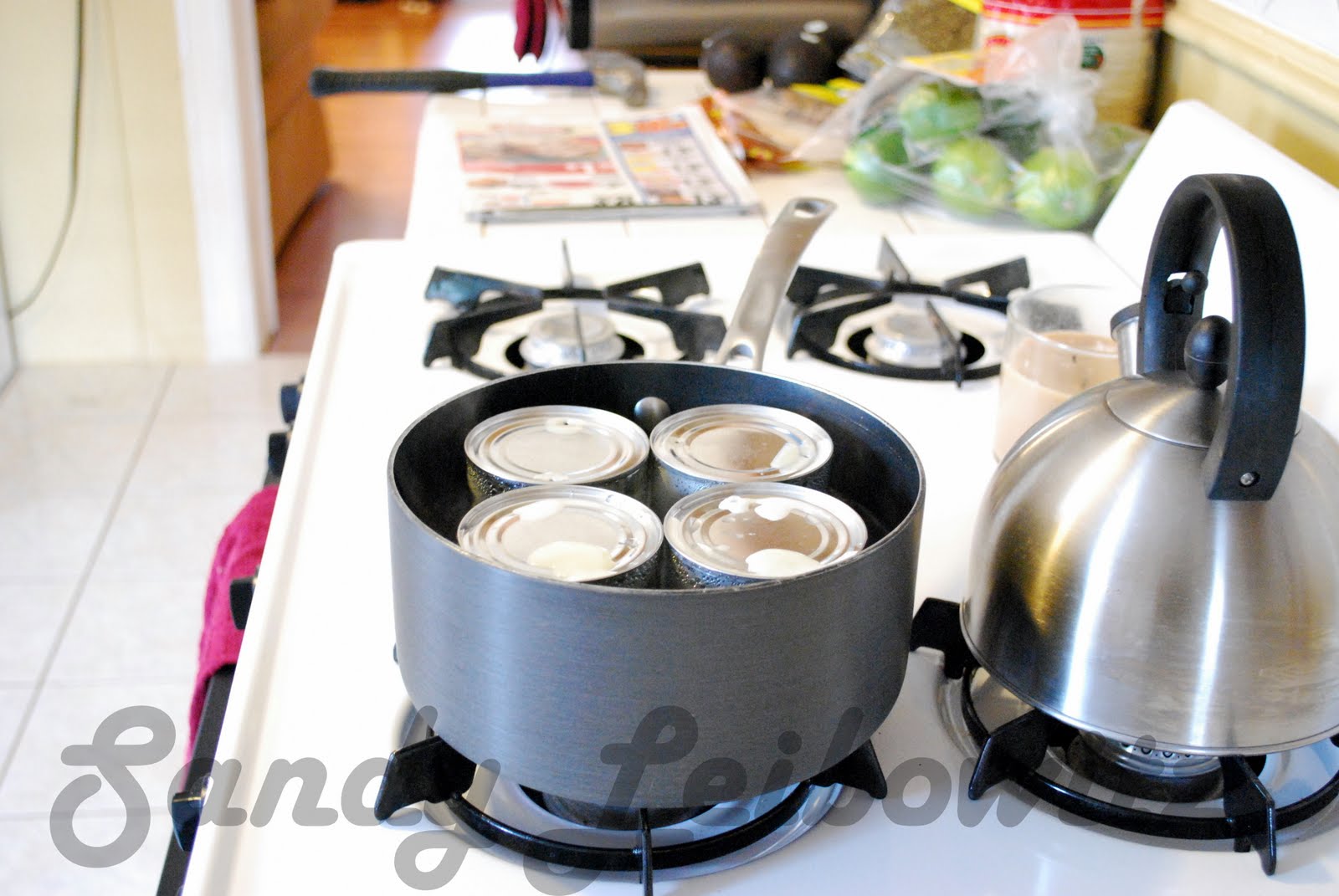 2. Next, place all the cans in a sauce pot and fill the bottom with water to come up about half way around the sides of the can. Put it on a low heat and go do things around the house.