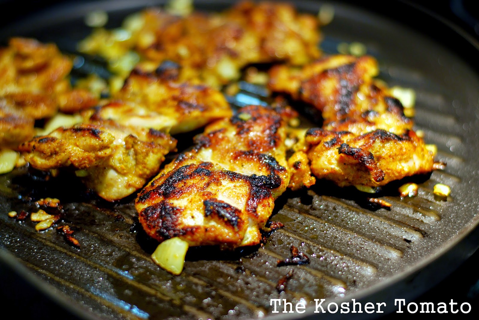 - Get a grill pan hot FIRST, then add a bit of Pam spray or olive oil and arrange your chicken evenly so it does not crowd the pan ( this is essential so the heat circulates throughout) Place sliced onion on top so the juices trickle down.